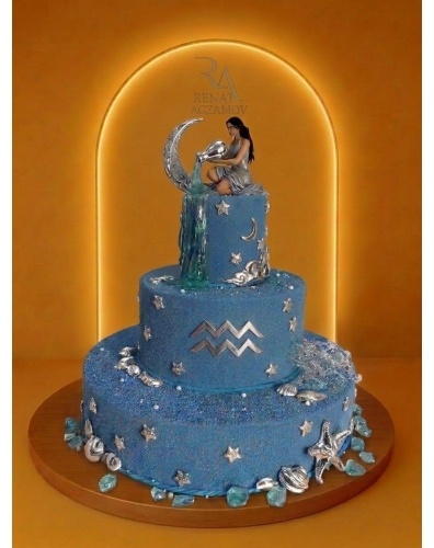 Торт круглой формы в 3 яруса. Покрыт бархатным шоколадным велюром в нежно-голубом цвете. Верхний ярус украшен эффектной скульптурной композицией: фигурка девочки, сидящей с кувшином, из которого льётся каскадом поток воды, стекающий по ярусу торта. За с ней — сверкающий шоколадный полумесяц, украшенный блёстками. Композицию дополняют миниатюрные звёзды разного размера, которыми украшены боковые поверхности всего торта, и нежные полупрозрачные «лепестки», напоминающие кристаллы льда, выполненные из карамели. Боковую поверхность верхнего яруса украшают объемные облака серебристого цвета выполненные из сладкой массы на основе какао масла и шоколада, а так же символом знака зодиака Водолей в серебряном цвете. Дополнительным акцентом являются жемчужины и звёзды из шоколада, покрытые серебром. Нижний ярус украшен декоративными ракушками и жемчужинами, разбросанными по поверхности. По низу торт украшен россыпью жемчужин и боем нежно-голубых кристаллов.