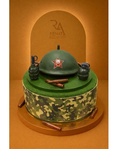 Оригинальный торт на заказ в 1 ярус, покрытый зеленым шоколадным велюром. Главным украшением торта являются каска, гранаты и патроны, выполненные из сладкой массы на основе какао-масла, лежащие на шоколадном постаменте. Боковая сторона торта украшена шоколадной камуфляжной лентой распечатанной на пищевом принтере по шоколаду.