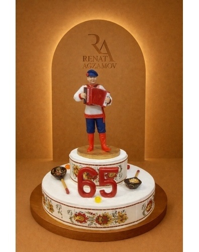 Верхний ярус торта украшает фигурка мужчины с баяном, выполненная из выполненная из сладкой массы на основе какао-масла по фото. Нижний ярус украшен