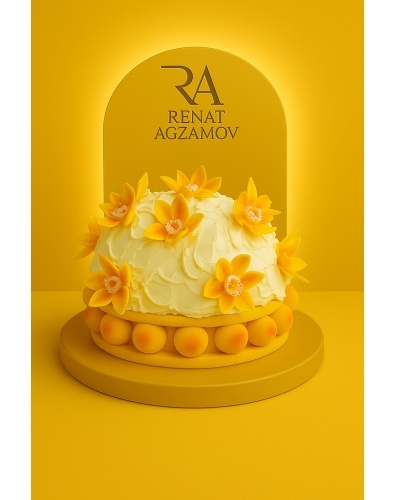 Необычный торт на заказ в 1 ярус. Главным украшением торта являются золотые орхидеи из бельгийского шоколада, выполненные по уникальной японской технологии. Сочетание декора из белоснежных сливок и покрытой шоколадным желтым велюром подставки из шоколадных шаров, в тон цветам, придает торту нежность и воздушность.