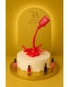 Круглый торт, покрытый нежно-розовым велюром. Главным украшением являются шоколадные туфельки, так же торт украшают карамельные полушария и сахарные бусинки.