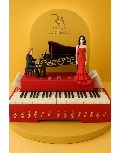 с роялем стоит фигурка девушки, выполненная так же из сладкой массы на основе какао-масла по фотографии.