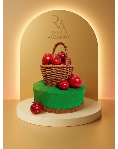 Торт круглый в 1 ярус, покрыт зеленым шоколадным велюром. Главным украшением торта является переплетенная корзинка с красными яблоками из сладкой массы на основе какао-масла, сделанная скульптором-художником вручную. Дополнительно торт украшен отдельно красными яблоками. По низу торт украшен шоколадным узором в цвет корзинки.