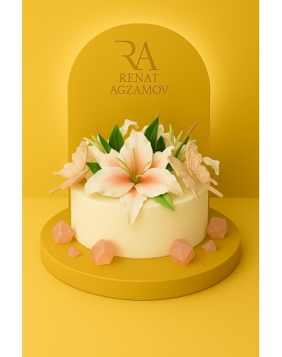 Торт в 1 ярус, покрытый шоколадным велюром белого цвета. Главным украшением торта являются шоколадные цветы, выполненные из бельгийского шоколада. Дополнена композиция карамельными бабочками и карамельными кристаллами с блестками.