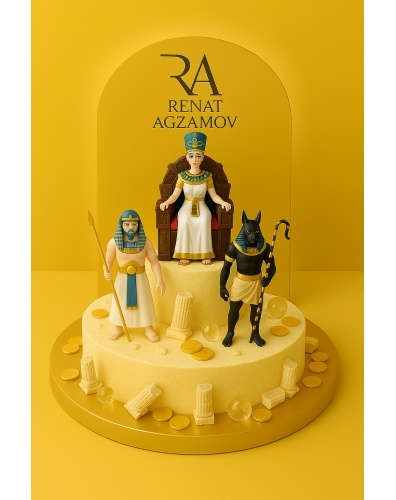 торта украшает египетская царица, сидящая на троне и выполненная из