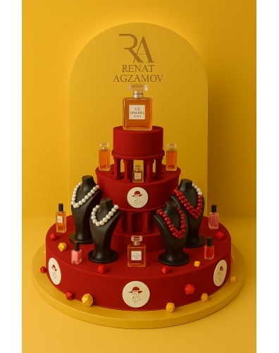 Торт в 4 яруса, покрытый красным бархатным велюром. Главным украшением торта являются бюсты, выполненные из шоколада в черном глянцевом цвете и украшающие нижний ярус торта. Бюсты украшены сладкими карамельными ожерельями в разной гамме. Дополняют торт духи, лаки, помады и кристаллы, выполненные из шоколада и карамели, а так же тематические картинки в виде сладкой фотопечати. Дополнительную высоту торту придают подставки из шоколада в виде колонн, которые так же как и торт покрыты красным бархатным велюром.