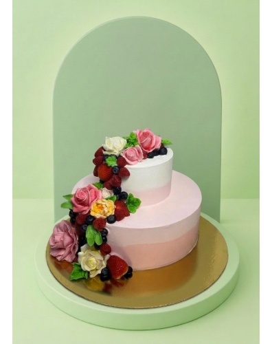 Торт в 2 яруса круглой формы покрыт сливками в градиенте от розового к белому. По боковой поверхности от верхнего яруса к нижнему спускается ветка из свежих ягод и зефирных цветов