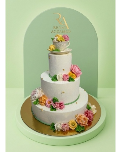 Торт в 3 яруса круглой формы покрыт бархатным шоколадным велюром в белом цвете. По всем ярусам торта расположены цветочные композиции из зефирных цветов. Дополнительным акцентом является сусальное золото, расположенное по всей поверхности торта. Верхний ярус украшает чашка с блюдцем в которой расположен пион.