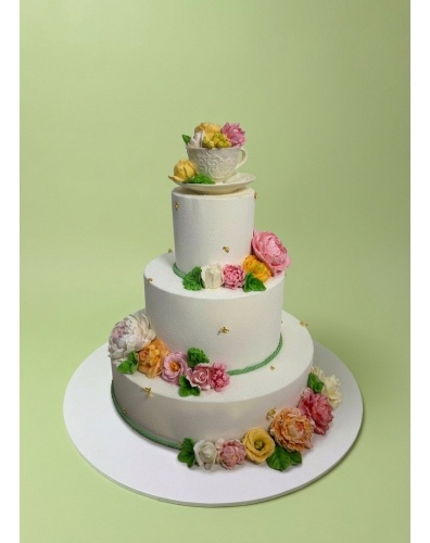 Торт в 3 яруса круглой формы покрыт бархатным шоколадным велюром в белом цвете. По всем ярусам торта расположены цветочные композиции из зефирных цветов. Дополнительным акцентом является сусальное золото, расположенное по всей поверхности торта. Верхний ярус украшает чашка с блюдцем в которой расположен пион.