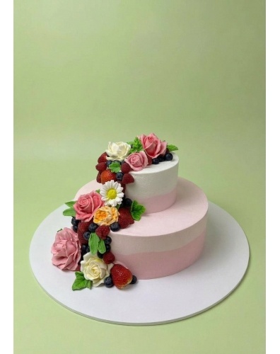 Торт в 2 яруса круглой формы покрыт сливками в градиенте от розового к белому. По боковой поверхности от верхнего яруса к нижнему спускается ветка из свежих ягод и зефирных цветов