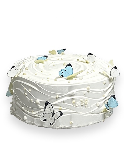 Белый одноярусный торт, украшенный сахарными бабочками белого и нежно-голубого цвета и жемчужинами разного размера. Боковая поверхность оформлена оригинальным сливочным узором.