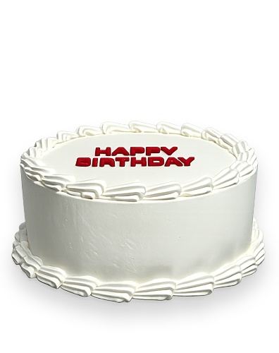 Торт в 1 ярус, украшенный надписью "С днём рождения". По нижней и верхней част торт украшен узорами из сливок.