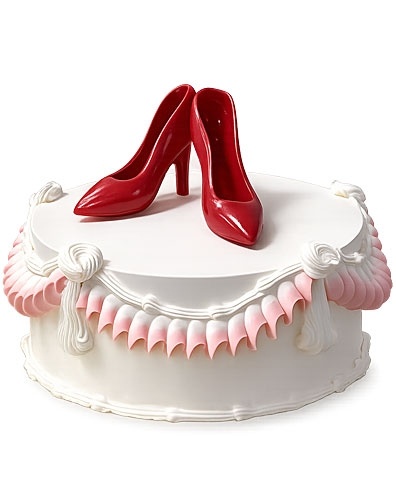 Торт в 1 ярус украшен шоколадными туфельками красного цвета. Боковая сторона торта украшена узором из сливок, сочетающимся по цветовой гамме с туфельками .