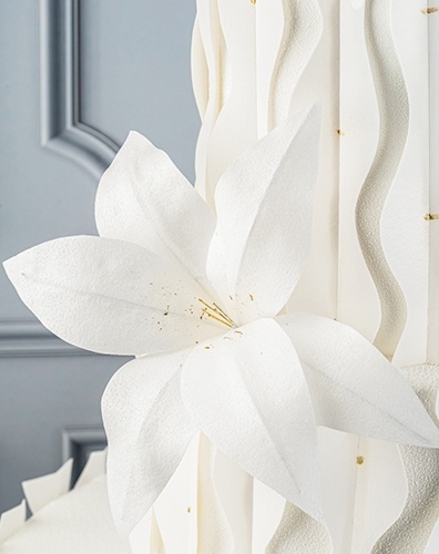 Торт круглой формы в 4 яруса, покрытый белым шоколадным велюром. Торт украшает оригинальный декор, который представляет собой волнистые полосочки из белой вафельной бумаги с золотыми точками по центру, которые придают геометрию дизайну. Дополняют композицию Топпер Инициалы золотого цвета и объемные лилии, выполненные из белой вафельной бумаги в общей стилистике торта.