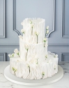 Торт круглой формы, в 4 яруса покрытый шоколадным велюром белого цвета. Нижние ярусы торта украшены воздушным декором из белой вафельной бумаги в разной стилистике. Нижний ярус выполнен в виде нежной объемной композиции, которая гармонично сочетается с декором второго яруса, выполненным тонкими полосками вафельной бумаги. Дополнительно два нижних яруса украшены воздушными пёрышками из вафельной бумаги. Третий ярус покрыт белым шоколадным велюром и дополнительно украшен сахарными жемчужинками разных размеров. Верхний ярус так же покрыт шоколадным бархатным велюром белого цвета и дополнен топпером с Инициалами золотого цвета.