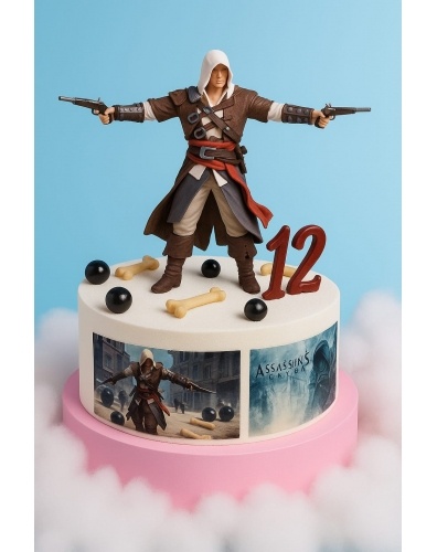 Торт на заказ в 1 ярус, покрытый велюром цвета слоновой кости. Главным украшением торта является фигурка персонажа игры. Фигурка изготовлена из сладкой массы на основе какао-масла по фотографии. Боковая сторона торта украшена фотографиями из игры, распечатанными на пищевом принтере по шоколаду.