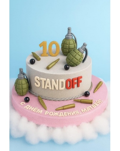 круглой формы, в 1 ярус, покрый светло-серым бархатным велюром. Торт