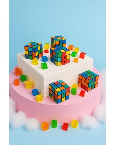 Квадратный торт в 1 ярус, покрытый шоколадным велюром белого цвета. Главным украшением торта являются шоколадные кубики Рубика. Дополнена композиция карамельными, разноцветными кубиками.