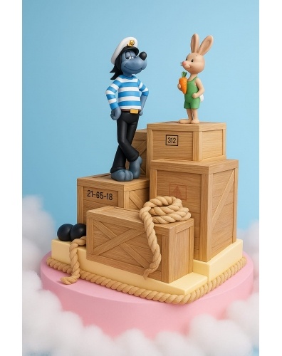 торте являются фигурки волка и зайца с морковкой в интересных поза,