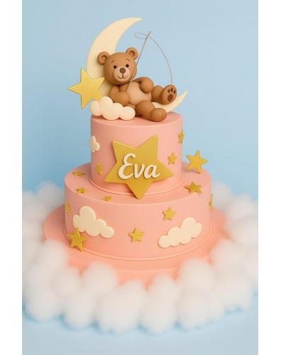 Торт круглой формы в 2 яруса, покрытый шоколадным велюром светло-розового цвета. Главным украшением торта является фигурка медвежонка, лежащего на полумесяце, выполненная из сладкой массы на основе какао-масла. Дополнительно торт украсят белые облачка из сладкой массы и золотые звездочки разного размера из сладкой массы и шоколада. На самой большой звезде написано имя.
