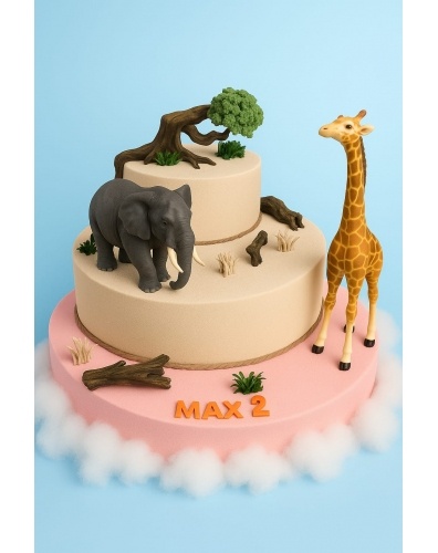 Торт круглой формы, в 2 яруса, покрытый бежевым бархатным велюром. Торт украшают реалистичные животные слон и жираф в интересных живых позах, выполненные из сладкой кондитерской массы на основе какао масла, а так же точечно поверхность ярусов украшена корягами и веточками с листиками и без в стиле «сафари». Дополняют торт участки с травой из шоколада реалистичного зеленого оттенка и в цвете выгоревшей травы.