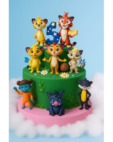 Торт украшают объемные фигурки героев животных, выполненные из сладкой массы на основе какао масла — 2 героя располагаются на верхнем ярусе и обнимают большую карамельную цифру в лесном стиле, 3 героя располагаются на нижнем ярусе торта в интересных живых позах и еще 3 героя располагаются перед тортом.