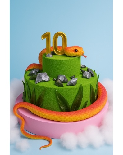 Торт в 2 яруса, покрытый шоколадным велюром зеленого цвета. Главным украшением торта является змея, обвивающая нижний и верхний ярусы, выполненная из сладкой массы на основе какао-масла. Нижний ярус торта украшен карамельными камнями и шоколадными листьями.
