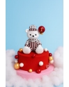 Нежный, детский торт на заказ в 1 ярус, покрытый шоколадным велюром нежно-желтого цвета. Торт украшен детскими игрушками: лошадка-качалка, пирамидка, юла, разноцветные кубики с именами. Декорации выполнены из сладкой массы на основе какао-масла.