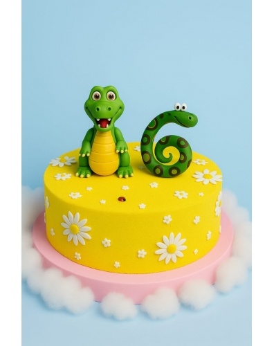 Торт в 1 ярус, покрытый шоколадным велюром желтого цвета. Главным украшением торта являются фигурки крокодила и змейки, выполненный из сладкой массы на основе какао-масла. Дополнена композиция сахарными ромашками.