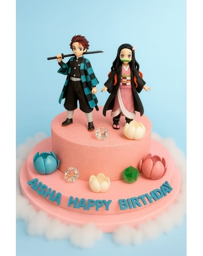 Торт 1 ярус, круглой формы, покрытый розовым бархатным велюром. Главным украшением торта являются фигурки героев в стиле аниме, выполненные из сладкой массы на основе какао масла. Дополняют композицию торта кристаллы из карамели разного размера в цветах прозрачный, розовый и тиффани, а так же поверхность торта и около торта украшена цветами из шоколадных полушариков в двухцветном исполнении в единой гамме с общей концепцией торта.