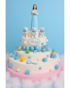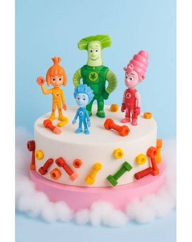 Круглый торт, покрытый белым шоколадным велюром. Торт украшен разноцветными шоколадными гайками и болтиками. На торте персонажи фигурок из мультфильма "Фиксики"  (Папус, Мася, Симка, Нолик),  выполненные вручную из сладкой массы на основе какао-масла.