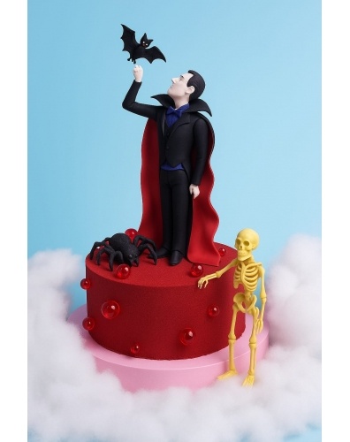 торта стоит фигурка вампира, держащего на ладошке летучую мышь,