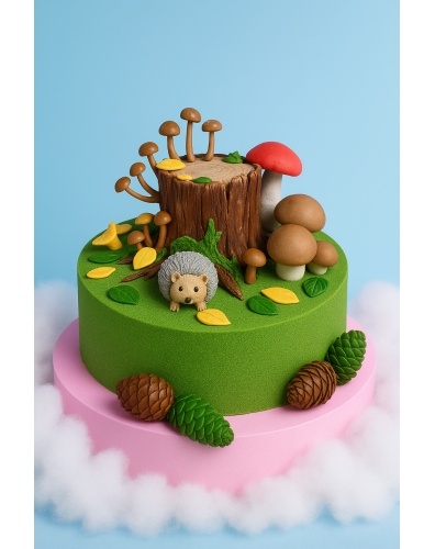 украшением торта являются грибочки, которые растут на зеленой поляне: