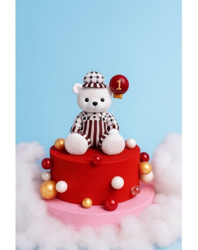 украшением торта является очаровательный медвежонок в костюме,