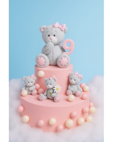 Торт для девочки в 2 яруса, покрытый шоколадным велюром розового цвета. Торт украшают фигурки Мишек Тедди с розовыми бантиками, выполненными из сладкой массы на основе какао-масла. Дополнена композиция шоколадными шариками розового и белого цвета.