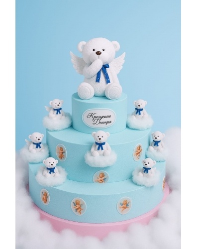 торт на заказ с медвежатами в 3 яруса, покрытый голубым шоколадным