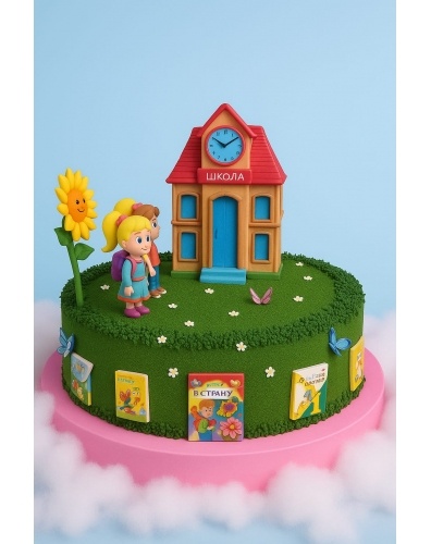 Торт на заказ в 1 ярус, покрытый шоколадным велюром зеленого цвета. Главным украшением торта являются фигурки детей, идущих к школе, вслед которым машет листиком подсолнух, выполненные из сладкой массы на основе какао-масла. Композиция дополнена шоколадной травой и сахарными ромашками. Боковая сторона торта украшена шоколадными книжками для 1-го класса.