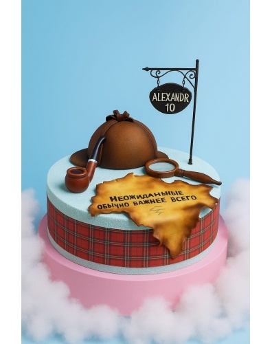 Торт на заказ в 1 ярус, покрытый шоколадным велюром голубого цвета.  Торт украшен шляпой, трубкой, лупой, "обрывком" записки и вывеской, выполненными из сладкой массы на основе какао-масла. Боковая сторона торта украшена шоколадной распечаткой.