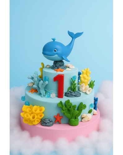Верхний ярус торта украшает фигурка кита, выполненная из сладкой массы