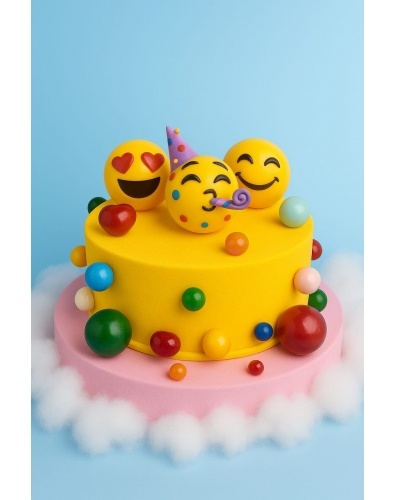 Главным украшением торта являются объемные фигурки смайликов, выполненные из шоколада и сладкой массы на основе какао-масла.