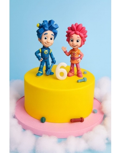 Торт на заказ в 1 ярус, покрытый желтым шоколадным велюром. На торте на шоколадном диске в цвет торта расположены 2 персонажа, выполненные из сладкой массы на основе какао-масла. Дополнена композиция разноцветными шоколадными гаечками и болтиками.
