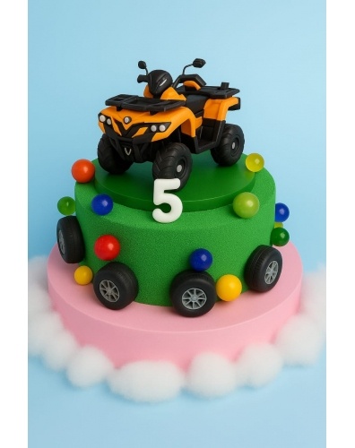 украшением торта является квадроцикл, выполненый из сладкой массы на