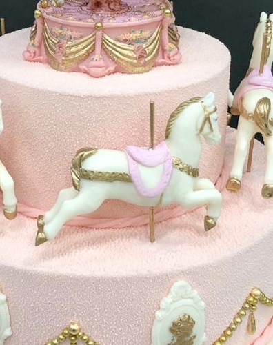 Торт в 2 яруса, покрытый нежно-розовым шоколадным велюром. На верхнем ярусе расположена шоколадная карусель с подсветкой, выполненная из бельгийского шоколада. На нижнем ярусе по кругу расположены шоколадные, бело-золотые лошадки. Нижний ярус по боковой части украшен белыми маленькими рамочками с золотыми камелиями в них, а так же гирляндой из золотых бусинок.