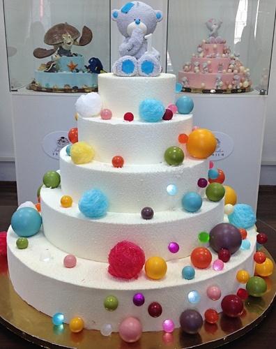 Нижние ярусы украшены разноцветными карамельными комками, светящимися