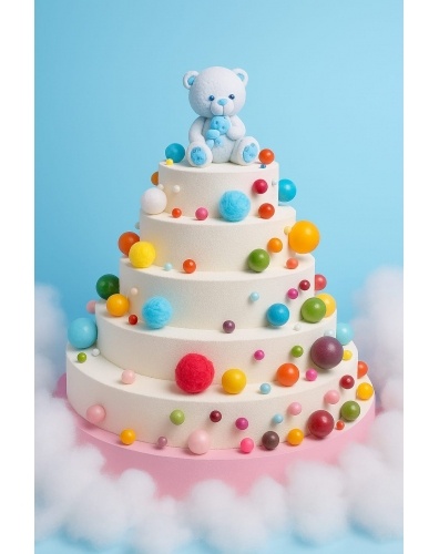 Верхний ярус торта украшает мишка Тедди, держащий шоколадную цифру.