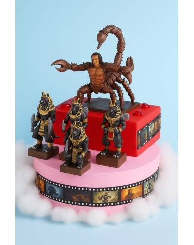 Квадратный торт, покрытый красным шоколадным велюром. По боковой части торта распечатка кадров из кинофильма. На торте и около торта размещены фигуры Царя Скорпионов и воинов Анубиса, выполненные вручную из сладкой массы на основе какао-масла.