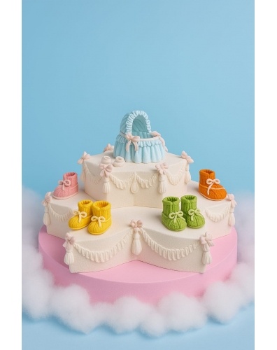 Торт на заказ в форме звезды Давида на день рождения ребенка. Верхний ярус украшает люлька, выполненная вручную из сладкой массы на основе какао-масла.
