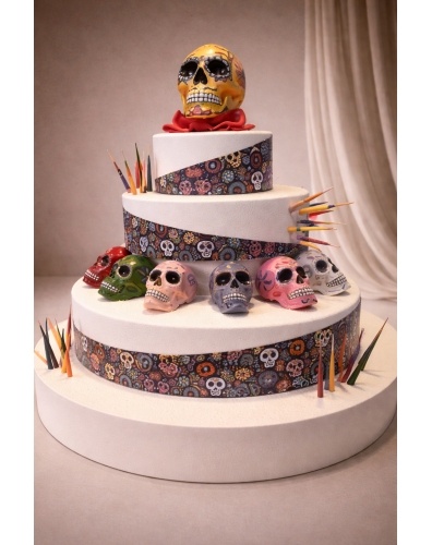 Верхний ярус торта украшает расписной череп большего размера с красным