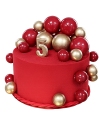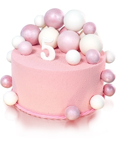 Круглый торт в 1 ярус, покрытый нежно-розовым шоколадным велюром. Торт украшен веткой шоколадных средних и маленьких шаров разного цвета.