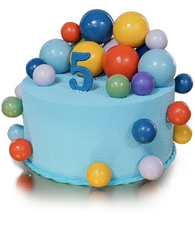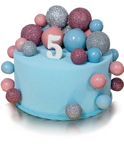 Круглый торт в 1 ярус, покрытый голубым шоколадным велюром. Торт украшен веткой шоколадных средних и маленьких шаров разного цвета.